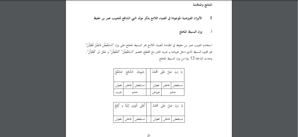 TAHLIL AL-AWZAN ALʻARUDIYAH WA TAGHYIRATUHA FI AL-DIYAʼ AL-LAMIʻ BI-DHIKR MAWLID AL-NABI AL-SHAFIʻI LIL-HABIB ʻUMAR IBN HAFIZ